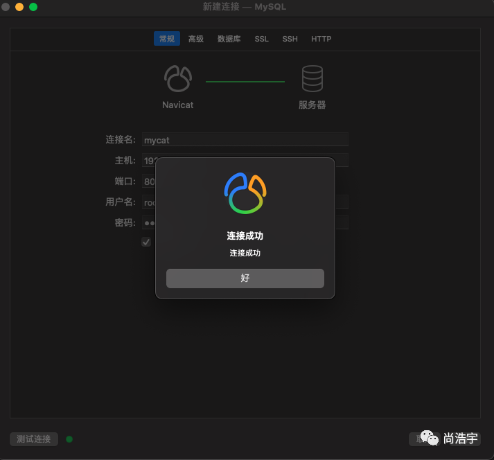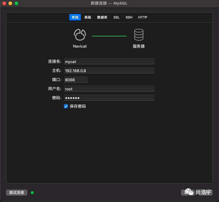 6、测试,打开Navicat,创建一个新链接,输入端口:8066,用户名:root,密码:123456(默认用户名密码,可修改conf/users/root.user.json)