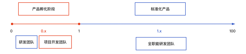 对于产品从 0-1 的阶段,特别是以项目孵化为主的阶段,建议以组建项目开发团队按照项目交付方式为主执行,同时配备少量关键的产品研发岗位,负责推进产品孵化工作。