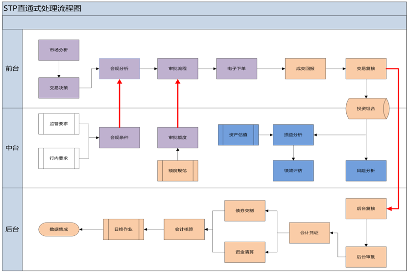 金融市场业务的大部分业务品种的完整业务流程都要经历前、中、后台三个阶段的处理。前台完成交易生命周期管理,中台负责信用风险管理、市场风险管理等风险管理职责,后台负责完成清结算工作以及账务核算工作。前中后台前后关联又各成体系,从业务上看是一种相对松散的关联关系。