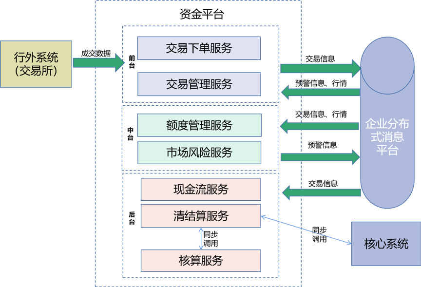 前台交易达成后,中后台需要根据交易要素完成信用额度扣减、市场风险扫描、收付款和账务核算工作,然而无论中台与后台的工作成功与否都不应影响前台交易数据的落地,因此前中后台的服务之间是需要进行解耦的。