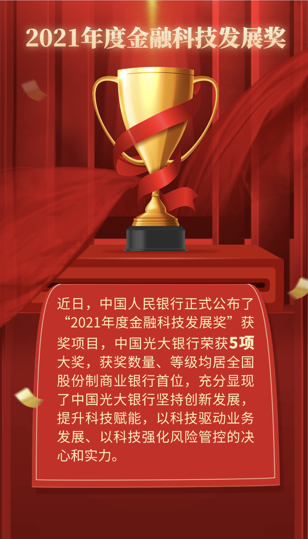 金融科技发展奖是人民银行、证监会为激励金融科技从业人员,表彰优秀科技成果,提高金融业信息化项目建设水平,带动金融业科技工作积极响应国家战略部署开展的重要金融科技奖项,是经国家科技部批准设立的金融行业科技类唯一部级大奖。从2009年初次参加评奖至今,中国光大银行累计获奖73项,其中一等奖2项、二等奖25项、三等奖46项,获奖数量及奖项等级稳步提升,金融科技应用成果达到国内一流水平,充分体现中国光大银行紧跟时代脚步,持续推进以科技引领、技术革新推动业务发展的坚定决心和实干精神,显示中国光大银行金融科技建设水平不断向更高的台阶步步迈进。