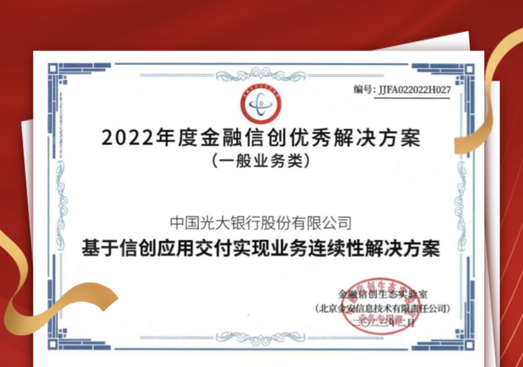 近日,中国金融电子化集团有限公司金融信创生态实验室在京举办金融信创解决方案研讨会,会上发布金融信创优秀解决方案并启动优秀案例分享。中国光大银行“基于信创应用交付实现业务连续性解决方案”以出色的技术实践和丰富的应用成效脱颖而出,成功入选“2022年度金融信创优秀解决方案”。