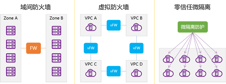 随着数据中心架构向云化演变以及云原生技术的推广应用,光大银行网络隔离和访问控制技术手段也随之进行了迭代和演进。由物理防火墙为代表的域间网络隔离方案,到以安全组为代表虚拟防火墙方案,逐步演进成为以微隔离技术为代表的零信任安全方案。