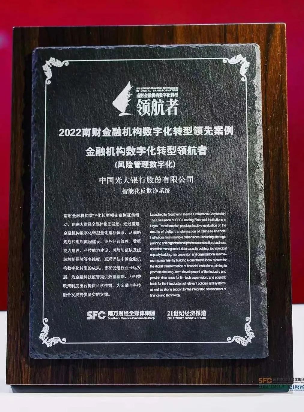 近日,由南方财经全媒体集团发起的金融机构数字化转型领先案例征集活动中,中国光大银行“智能化反欺诈平台”获得“金融机构数字化转型领航者专项案例(风险管理数字化)”奖项。