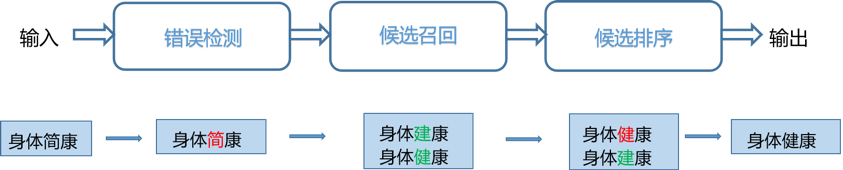 文本纠错有两种解决方案:基于统计语言模型的纠错方法和基于深度学习的纠错方法。文本纠错问题一般分为1)错误检测2)候选召回3)排序模型 3个步骤,其系统框架如下图所示: