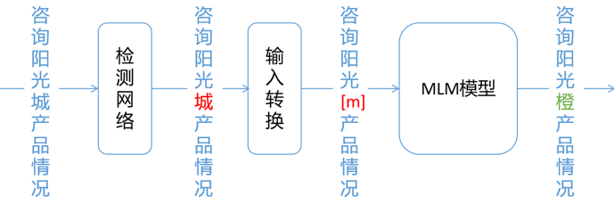 与基于统计语言模型的文本纠错方法不同,基于深度学习的文本纠错方法可以不依赖混淆词典,而是通过模型作为候选词生成器,同时结合检测网路实现文本纠错。目前常用掩码语言模型(Mask language model,MLM)进行纠错。MLM训练的原理为在输入时将部分字进行掩蔽,让模型利用上下文语义信息预测被掩蔽字,进而具备学习预测被掩蔽字的能力。其用在文本纠错中的思路为,先通过检测网路找出错误字,将其进行掩蔽(Masking)后输入MLM预训练模型预测正确结果。如下图所示。