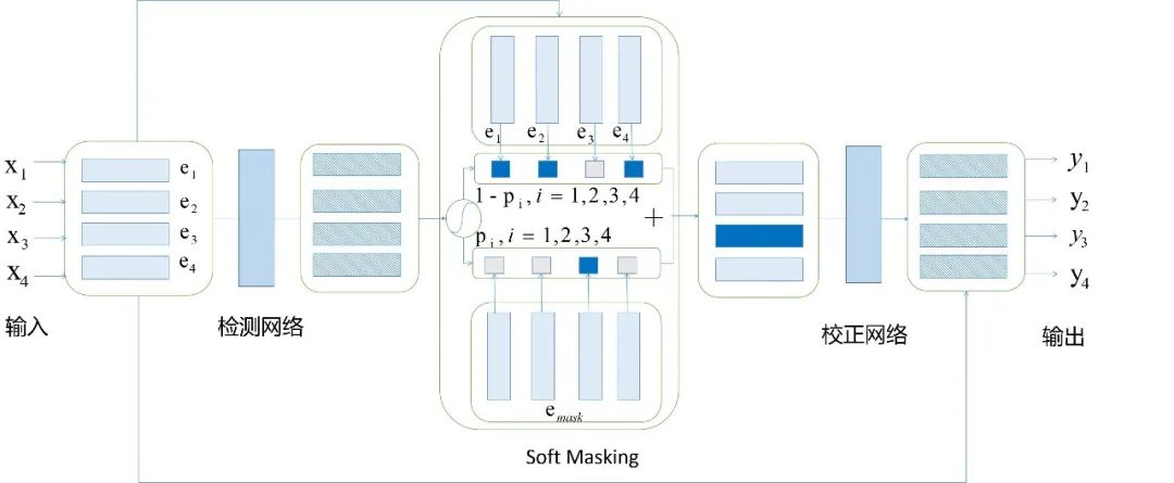 具体地,Soft-Mask BERT首先为输入语句中的每个字符创建嵌入。接下来,它使用检测网络以嵌入序列作为输入和输出字符序列的错误概率。然后计算输入嵌入和[MASK]嵌入的加权和,并根据误差概率进行加权。计算得到的嵌入以软的方式掩盖了序列中可能出现的错误。然后将该嵌入序列输入到修正网络。修正网络是一个BERT模型,它的最后一层由一个针对所有字符的softmax函数组成。在输入嵌入项和最终层的嵌入项之间还有剩余的连接。Soft-Mask BERT可以在端到端联合训练过程中学习正确的上下文,进而纠正错误。