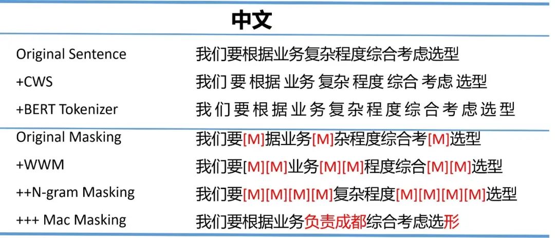图4对比了几种不同的Masking方式。可以看出,BERT使用的OriginalMasking随机从句子中找到Masking词进行字符[M]掩盖,WWM使用整词进行掩盖,N-gram Masking与WWM类似,使用词或短语的方法进行掩盖。MacBERT使用的MacMasking方法与N-gram Masking类似,不同的是它使用同义词代替[M]字符进行掩盖。这种方式的原因为,MacBERT的目标是利用BERT模型进行微调(finetune)任务,而[M]字符只在预训练(pretrain)阶段使用,使用同义词替换的方式有效解决了使用BERT训练上下游不一致的问题。