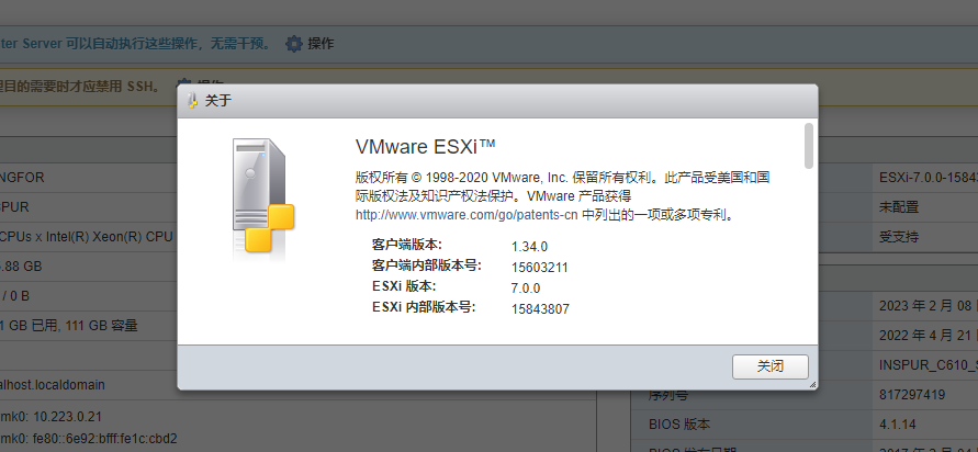 方式1:登陆EXSi后台,点击帮助-关于,即可获取版本号。