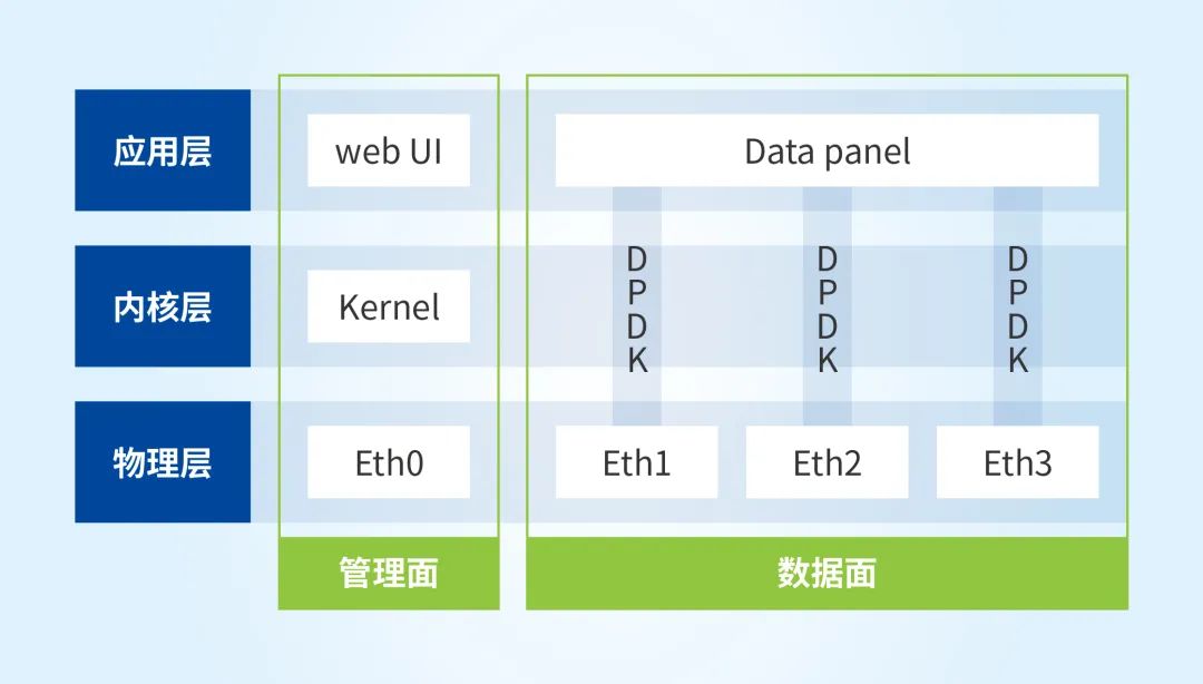数据面采用纯应用层架构,硬件通过应用层驱动接管,不再走内核中断,避免了内核和应用层的上下文切换,也减少了硬件中断对正在执行的流程的打断。所有数据处理流程实现自主控制,协议栈可以做到高度优化。