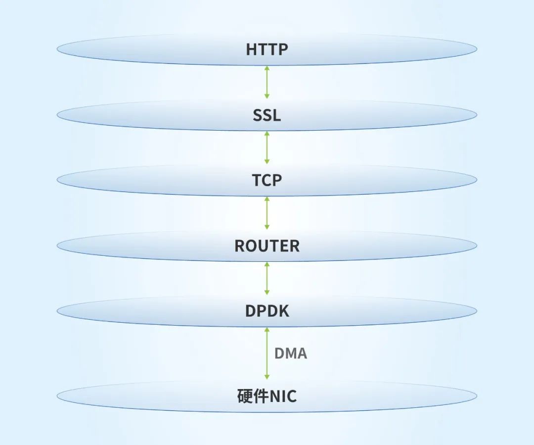 网卡硬件NIC通过DMA技术上送到应用层驱动、路由框架、TCP协议栈、SSL协议栈、HTTP协议栈,通过数据性能改造的方式一直复用,保证数据协议处理过程中不使用任何拷贝。