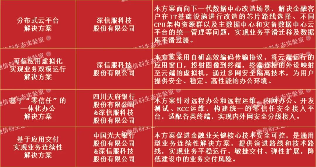 本月,由金融信创生态实验室组织评选的金融信创解决方案(第二批)正式发布。信服云超融合、桌面云、应用交付信创升级方案经多环节、多轮次审核甄选后,从众多方案中脱颖而出,顺利入选。
