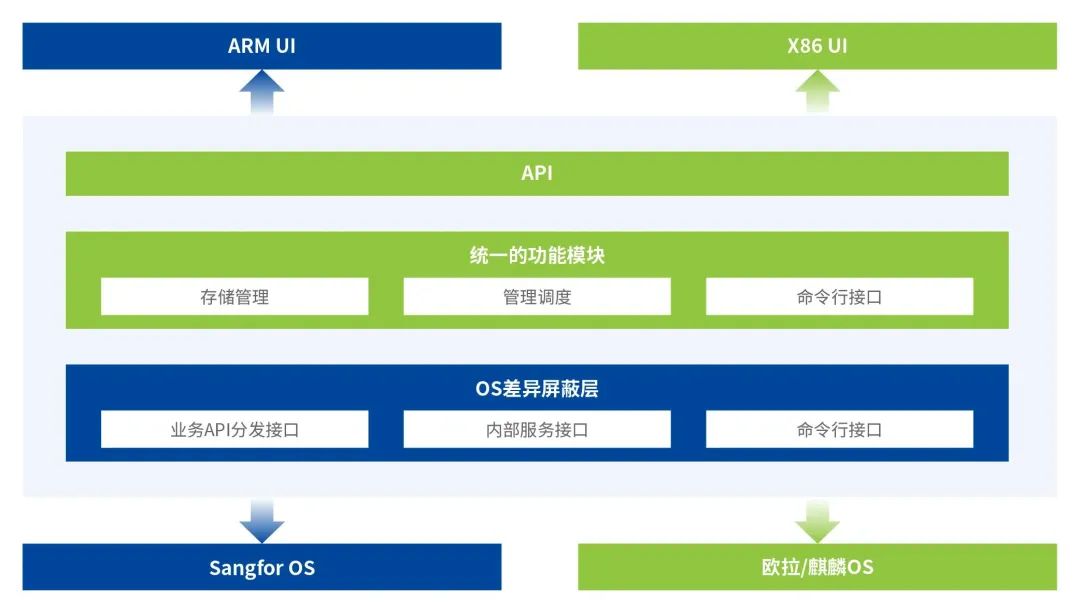 以信创超融合为基底的分布式信创云平台解决方案将ARM与X86两种架构体系深度融合,可在业务API层与OS差异屏蔽层识别、屏蔽异构CPU带来的功能差异,以软件技术跨越不同服务器硬件间的兼容阻碍,保障信创非信创模式下的功能统一,帮助用户完成业务的平滑过渡与产品的无感替换。在产品性能上,信创超融合全面对齐非信创模式,从计算、存储、网络三个方面对性能进行优化,可稳定承载用户核心业务,实现“产品能力双模拉齐,提高IT架构先进性”的升级效果。