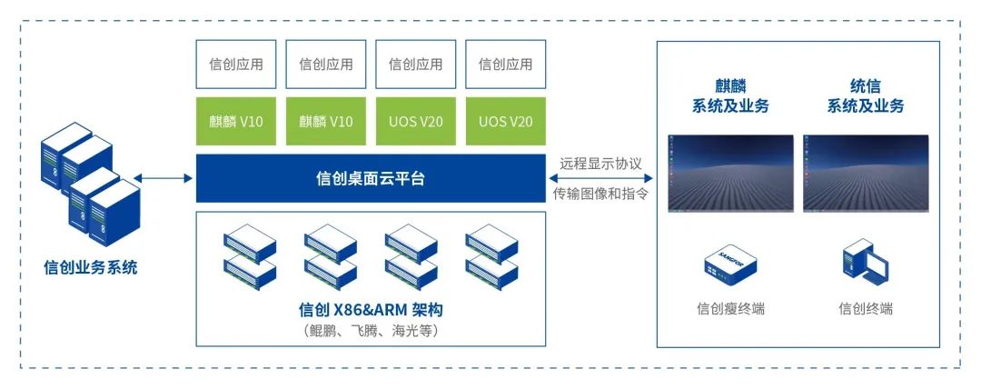信创桌面云以兼容ARM和C86两套CPU架构的服务器为底座,可在池化现有硬件资源的同时,根据不同的信创业务体系下发不同操作系统的信创桌面,用户也可根据办公终端的部署情况及时利旧现有的瘦终端与PC,提高资源利用率。同时,对于业务中常用的信创桌面云充分保留了业务架构的升级潜力,随着国产操作系统与软件的兼容性日趋完善,用户可逐渐将办公软件向信创桌面迁移,实现数字化办公体系的全面信创。