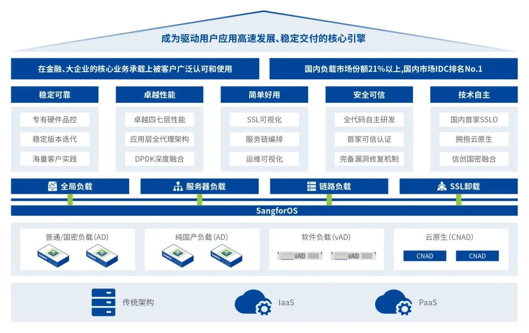 在业务的安全方面,信创AD支持以国际通用算法+国密算法的SSL安全加解密能力,保证互联网中流量信息传输的安全性。用户也可通过流量编排技术进一步优化安全设备的管理手段,保障业务安全。