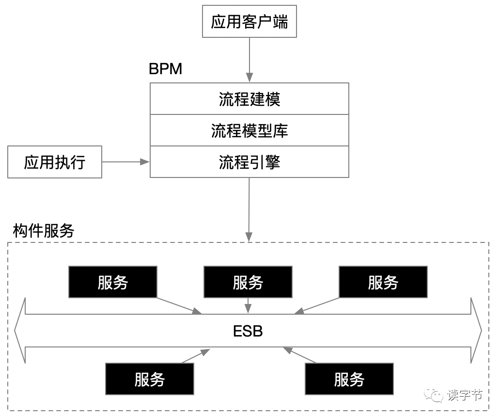如上图所示:这是一种SOA架构的解决方案,与ESB和BPM的基础中间件结合,BPM作为一个业务流程管理平台,很好的将SOA服务通过流程建模的形式,与业务流程逻辑联系在一起。那么这个过程中,BPM支撑SOA架构的业务流程协作问题,ESB支撑SOA架构的数据交换问题。这个架构体系是不是看起来就比较完整了!