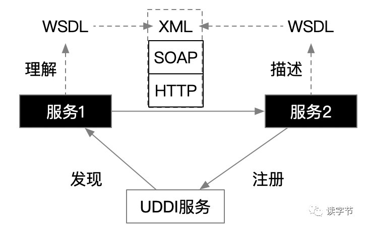 因此WebService的技术实现方案就非常符合SOA架构中服务的异构平台兼容性要求(SOAP),并且具备完整规范的服务接口语义描述(WSDL)和服务注册发现管理的规范定义(UDDI)。
