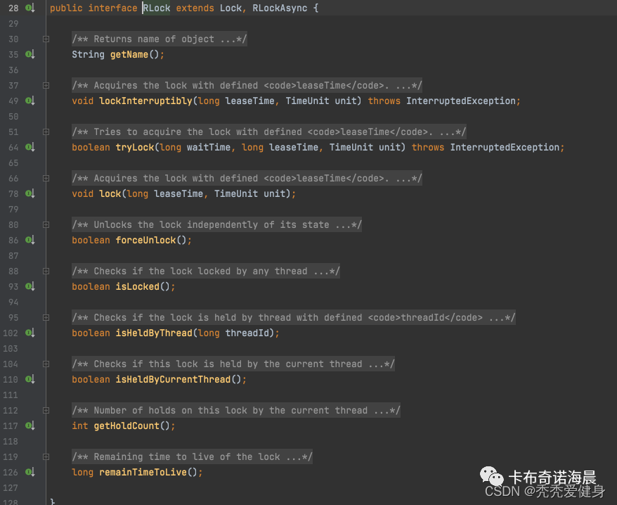 RLock接口主要继承了Lock接口,并扩展了部分方法,比如:tryLock(long waitTime, long leaseTime, TimeUnit unit)方法中加入的leaseTime参数,用来设置锁的过期时间,如果超过leaseTime还没有解锁的话,redis就强制解锁;leaseTime的默认时间是30s。