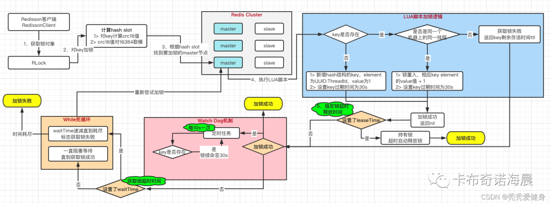 这⾥计算出key的hash slot之后,就可以通过hash slot 去看⼀看哪个master上有这个hash slot,如果某个master上有个这个hash slot,那么这个 key当然就会落到该master节点上,执⾏加锁指令也就应该在该master上执⾏。