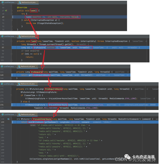 在寻找应该在哪台Redis机器上加锁时,在RedissonLock#tryLockInnerAsync()方法中我们看到了一堆LUA脚本: