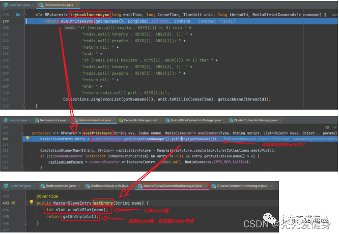 ConnectionManager#getEntry(String)方法会根据传入的key名称找到相应的Redis节点、目标master。
