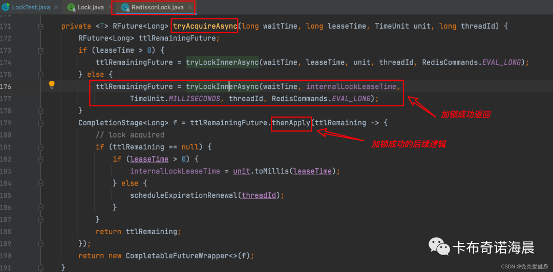 @Overridepublic boolean tryLock(long waitTime, long leaseTime, TimeUnit unit) throws InterruptedException {long time = unit.toMillis(waitTime);long current = System.currentTimeMillis();long threadId = Thread.currentThread().getId();Long ttl = tryAcquire(waitTime, leaseTime, unit, threadId);// lock acquiredif (ttl == null) {return true;}// 获取锁剩余的等待时长time -= System.currentTimeMillis() - current;if (time <= 0) {// 获取锁超时,返回获取分布式锁失败acquireFailed(waitTime, unit, threadId);return false;}current = System.currentTimeMillis();CompletableFuture<RedissonLockEntry> subscribeFuture = subscribe(threadId);try {// 订阅解锁channel的超时时长为 获取锁剩余的等待时长subscribeFuture.get(time, TimeUnit.MILLISECONDS);} catch (TimeoutException e) {if (!subscribeFuture.completeExceptionally(new RedisTimeoutException("Unable to acquire subscription lock after " + time + "ms. " +"Try to increase 'subscriptionsPerConnection' and/or 'subscriptionConnectionPoolSize' parameters."))) {subscribeFuture.whenComplete((res, ex) -> {if (ex == null) {unsubscribe(res, threadId);}});}acquireFailed(waitTime, unit, threadId);return false;} catch (ExecutionException e) {acquireFailed(waitTime, unit, threadId);return false;}try {// 收到解锁channel的消息之后,走到这里,再次判断获取锁等待时长是否超时time -= System.currentTimeMillis() - current;if (time <= 0) {acquireFailed(waitTime, unit, threadId);return false;}// while循环中尝试去获取锁while (true) {long currentTime = System.currentTimeMillis();ttl = tryAcquire(waitTime, leaseTime, unit, threadId);// lock acquiredif (ttl == null) {return true;}time -= System.currentTimeMillis() - currentTime;if (time <= 0) {acquireFailed(waitTime, unit, threadId);return false;}// waiting for messagecurrentTime = System.currentTimeMillis();if (ttl >= 0 && ttl < time) {// 如果获取锁失败后,锁存活时长 小于 剩余锁等待时长,则线程睡眠 锁存活时长commandExecutor.getNow(subscribeFuture).getLatch().tryAcquire(ttl, TimeUnit.MILLISECONDS);} else {// 如果获取锁失败后,锁存活时间 大于等于 剩余锁等待时长,则线程睡眠 锁等待时长commandExecutor.getNow(subscribeFuture).getLatch().tryAcquire(time, TimeUnit.MILLISECONDS);}time -= System.currentTimeMillis() - currentTime;if (time <= 0) {acquireFailed(waitTime, unit, threadId);return false;}}} finally {unsubscribe(commandExecutor.getNow(subscribeFuture), threadId);}}