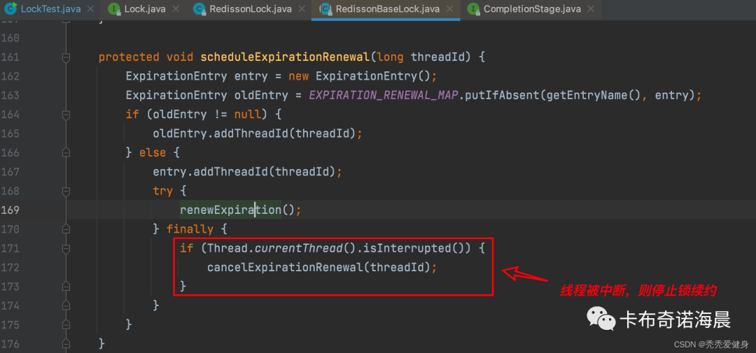 如果当前持有锁的线程被中断了,会停止锁续约,即杀死看门狗;