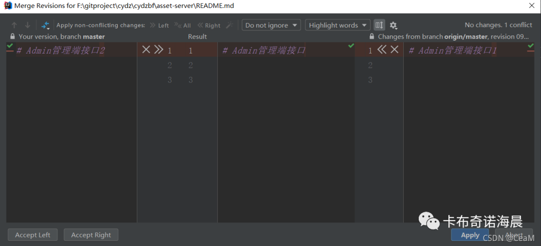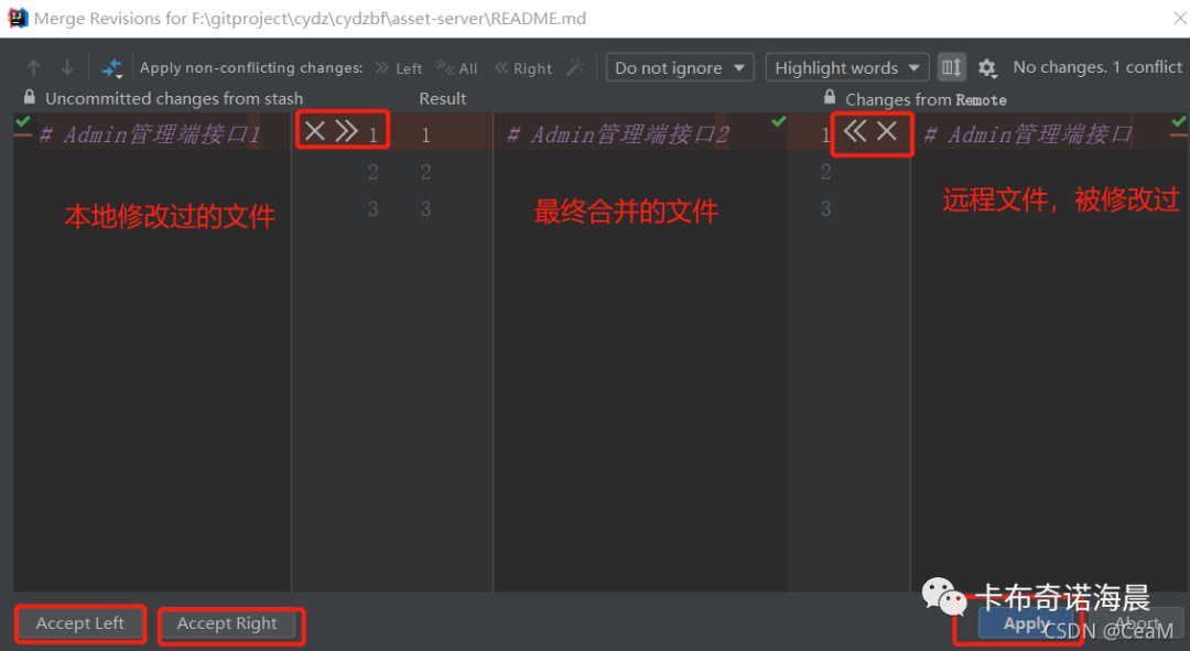 【Accept Right】其实就相当于是之前的 Accept Yours 和 Accept Theirs , 右下角的【Apply】是确认合并,【Abort】是取消合并。