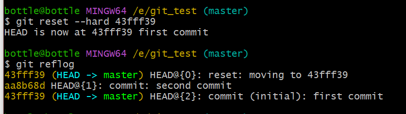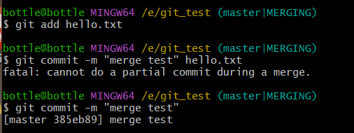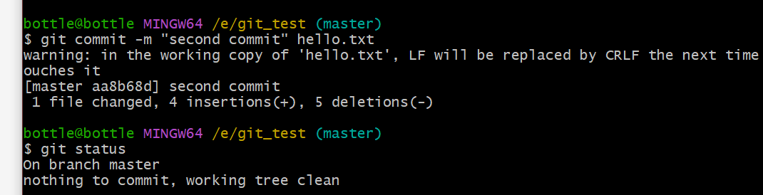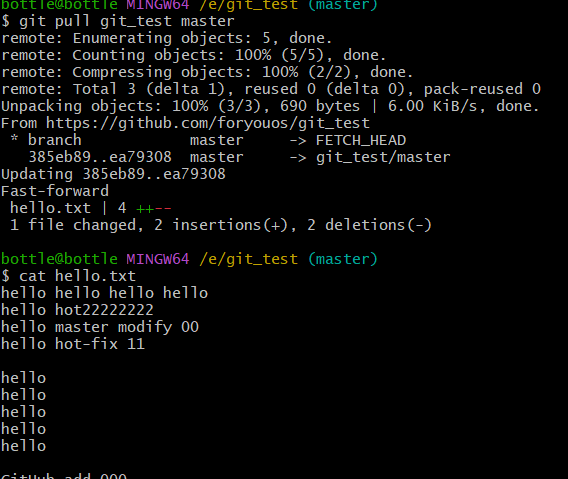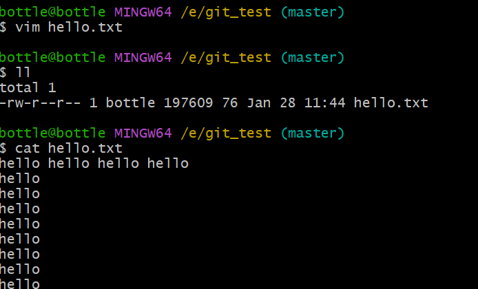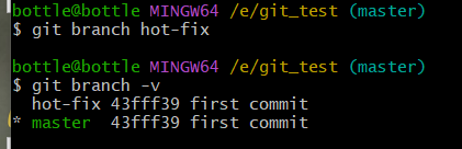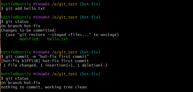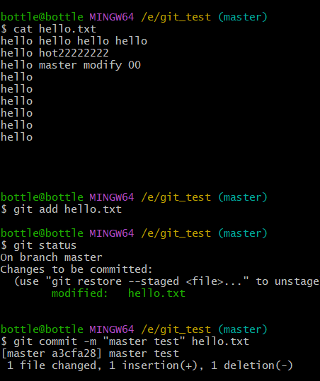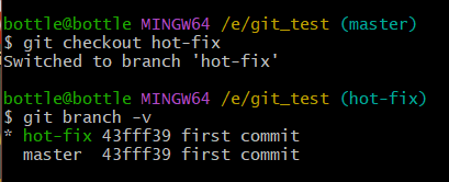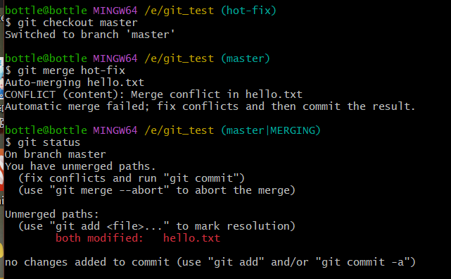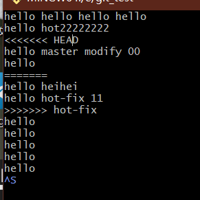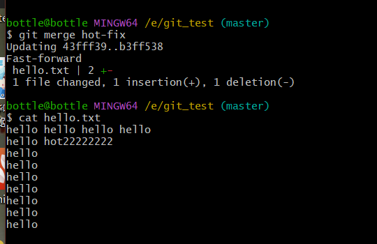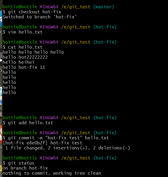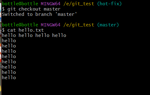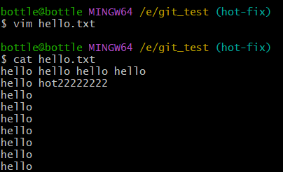 vim hello.txtcat hello.txtgit add hello.txtgit commit -m "master test" hello.txt//切换分支再次操作git checkout hot-fixvim hello.txtcat hello.txtgit add hello.txtgit commit -m "hot-fix test" hello.txt//切换到master分支git checkout master
