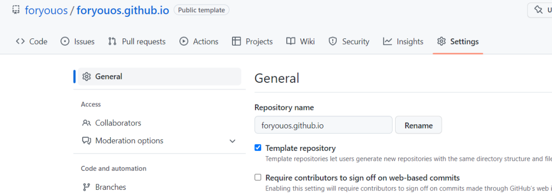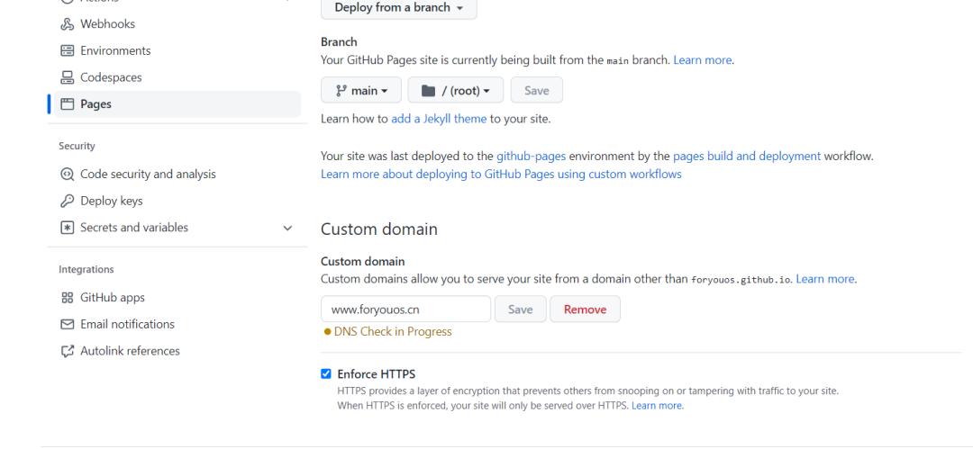 进入主项目的 setting 设置个人的项目名 id.github.io,在左边的 page 下设置个人域名,在并强制 HTTPS