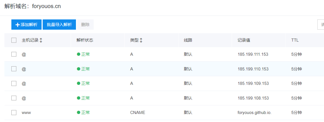 在域名服务端设置(以百度云为例) 除了第五个记录值改为自己的其它完全相同