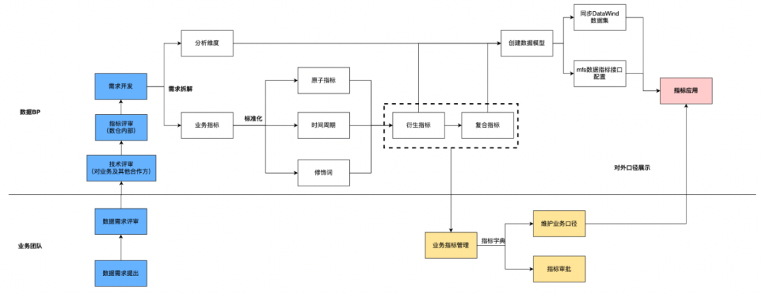 数据BP需要进行业务指标和分析维度的拆分,对于指标需先考虑指标字典中是否存在(防止重复开发),如果不存在, 需要拆解为原子指标+时间周期+修饰词, 并落入到指标平台;根据实际应用场景采用DataWind数据集或数据接口输出指标。