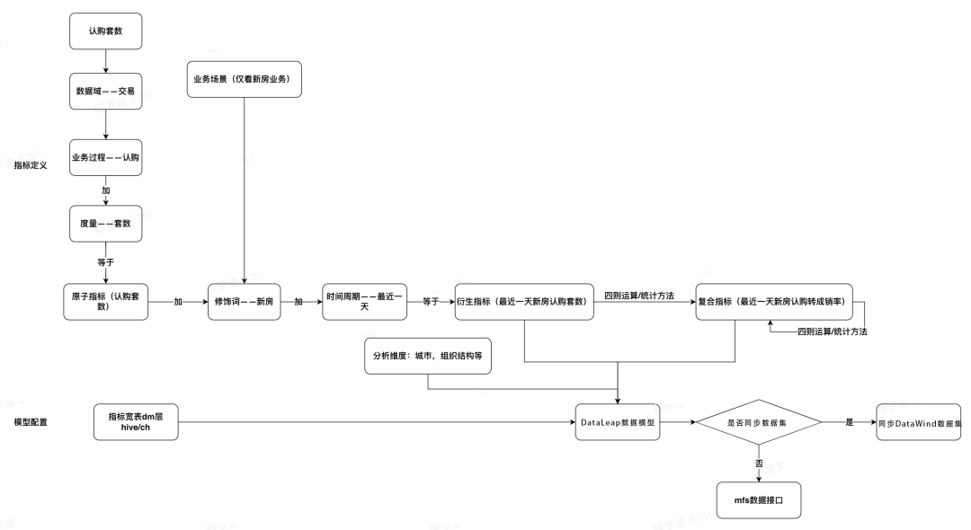 指标拆解完成后,对原子指标、衍生指标和复合指标进行创建和技术口径维护,结合需求创建数据模型打通DataWind数据集和mfs数据服务。