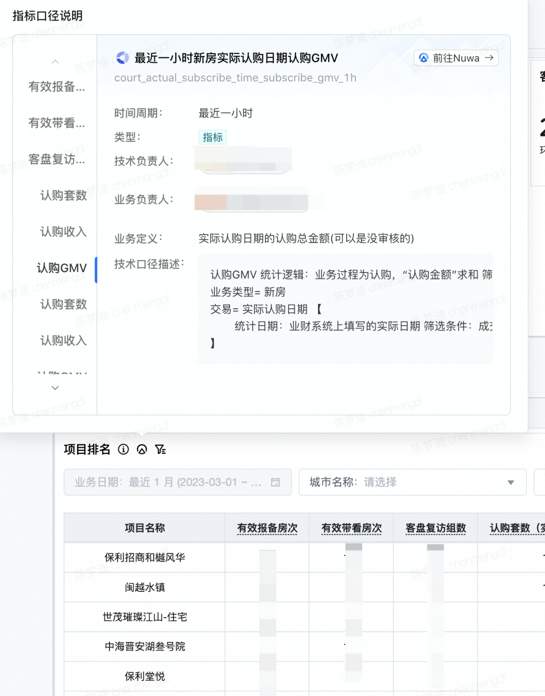 LOOK数据模块整体通过指标平台提供指标服务,看板上查看看板涉及的指标的口径,降低DA口径同步的成本。
