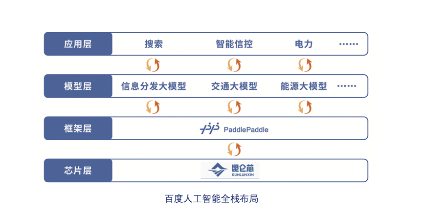 此外,从2017年百度宣布All in AI到今天的6年多里,百度还建立了全栈AI技术构架,百度将这样的技术构架分为四层,分别是芯片层、框架层、模型层和应用层。