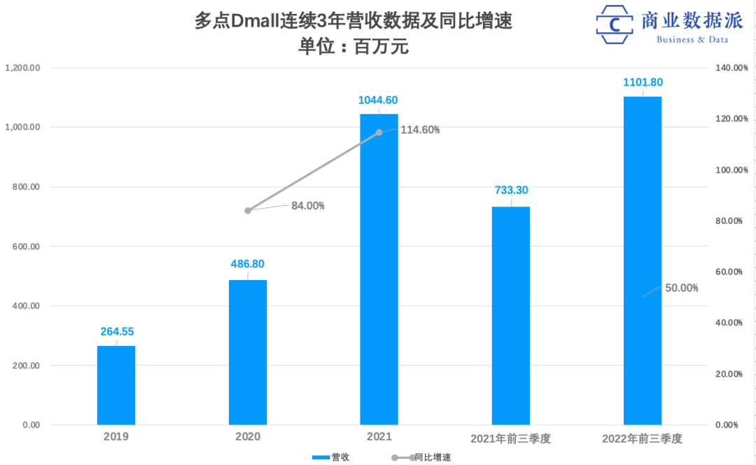 从零售商痛点出发,逐步形成全链条的能力矩阵,这样的思路在商业化方面初见成效。公开数据显示,2019年至2022年收入快速增长,2020年和2021年收入同比增速高达84%和115%。2022年前9个月增速也超过50%。这说明,迈过前5年的模式打磨期,多点Dmall业务正在起量,零售SaaS模式已逐步跑通。