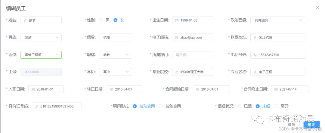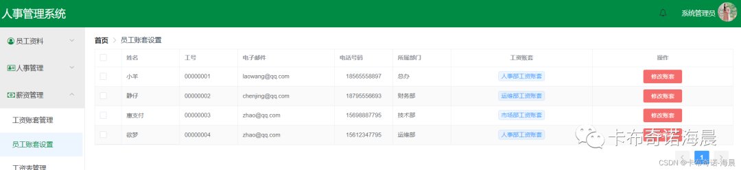 @Slf4j@RestController@AllArgsConstructor@RequestMapping("/api/users")public class CeamSysUserController {private final ICeamSysUserService ceamSysUserService;@GetMappingpublic ResponseEntity page(PageableDTO pageableDTO) {IPage<CeaMSysUserVO> ceaMSysUserVOIPage = ceamSysUserService.pageCeaMSysUserVO(pageableDTO);return ResponseEntity.ok(ceaMSysUserVOIPage);}@PostMappingpublic ResponseEntity<Object> add(@RequestBody CeaMSysUserDTO data) {ceamSysUserService.add(data);return ResponseEntity.ok("成功");}@PutMappingpublic ResponseEntity<Object> edit(@RequestBody CeaMSysUserDTO data) {ceamSysUserService.edit(data);return ResponseEntity.ok("成功");}@DeleteMappingpublic ResponseEntity<Object> add(@RequestParam String id) {ceamSysUserService.remove(Long.parseLong(id));return ResponseEntity.ok("成功");}}