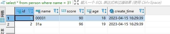INSERT INTO test.person (id, name, score, age, create_time) VALUES(1, '00031', 90, 18, '2023-04-15 16:29:39');INSERT INTO test.person (id, name, score, age, create_time) VALUES(2, '31a', 96, 19, '2023-04-15 16:29:39');