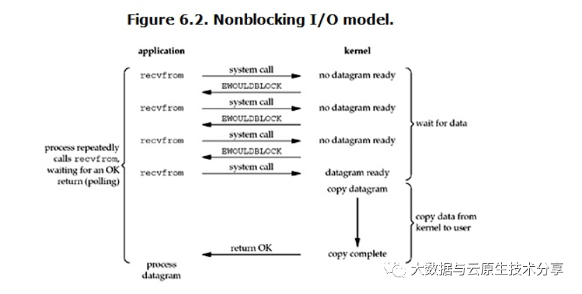同步非阻塞IO(Non-blocking IO):默认创建的socket都是阻塞的,非阻塞IO要求socket被设置为NONBLOCK。
