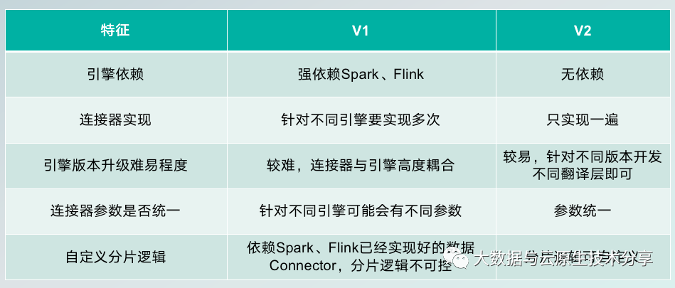 V1 架构中,SeaTunnel 的连接器和异构数据都是强依赖分布式计算引擎的,对于不同的计算引擎,会有不同的一个 API 层,连接器也都依赖着 Spark 和 Flink,已经开发好的连接器本质上也都是 Spark connector 和 Flink connecter。