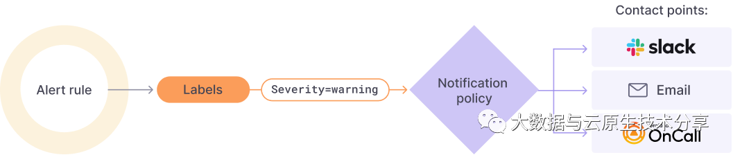 路由警报:根据您定义的标签将每个警报实例路由到特定的联系点。通知策略是一组规则,用于将警报路由到联系点的位置、时间和方式。