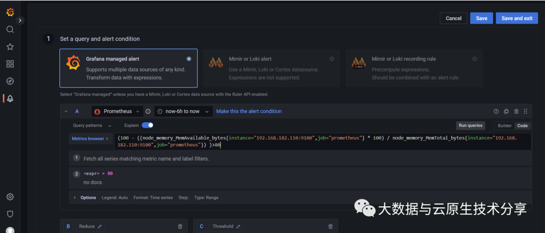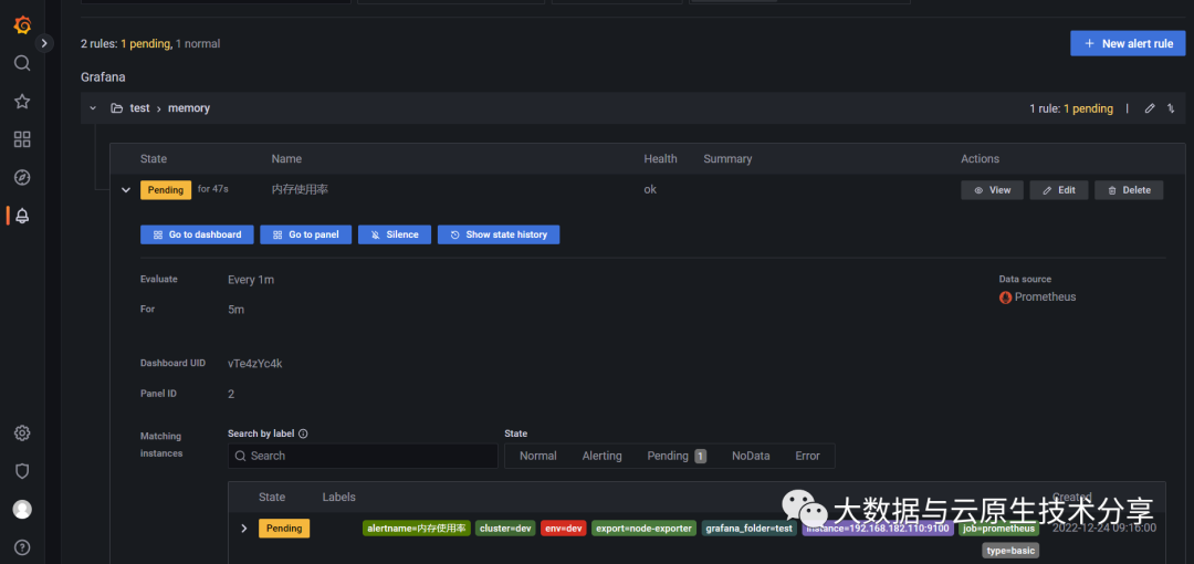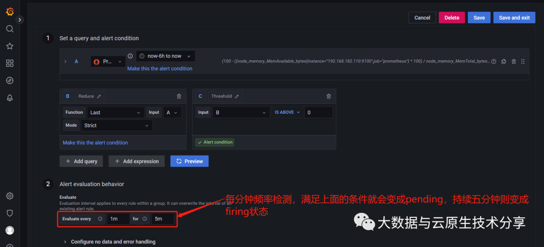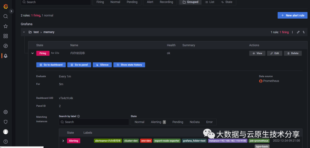 Alert rules(告警规则)——设置确定是否触发警报实例的评估条件。告警规则由一个或多个查询和表达式、条件、计算频率以及满足条件的持续时间(可选)组成。