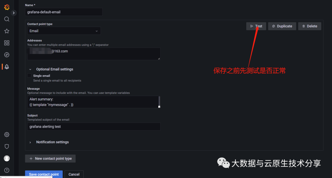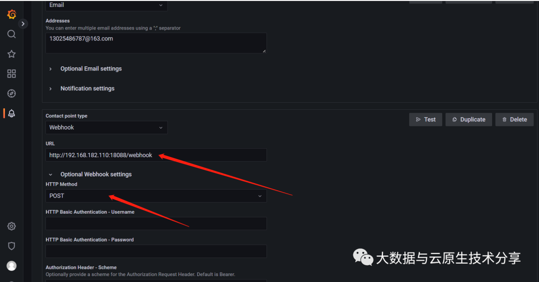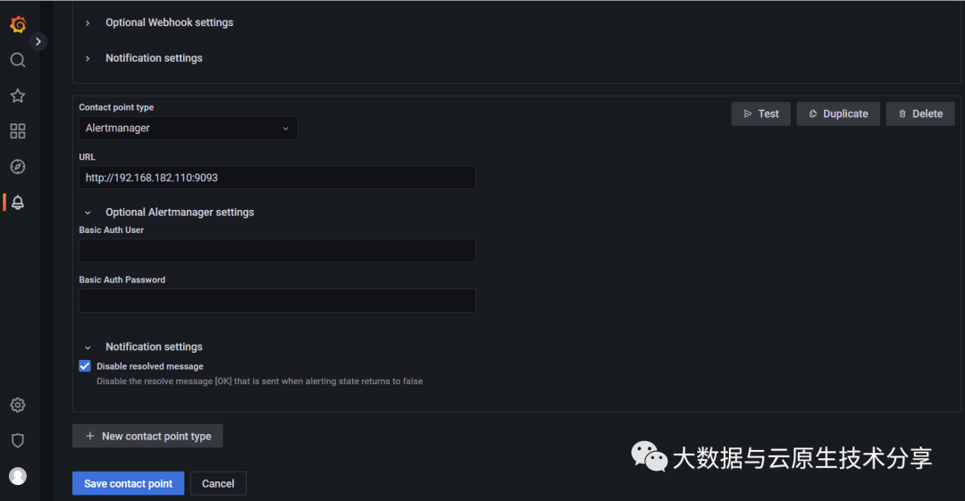 Contact points(联络点即告警通道)——定义在警报触发时如何通知联系人。我们支持多种 告警通道,例如:邮件、webhook、alertmanager、钉钉等等。