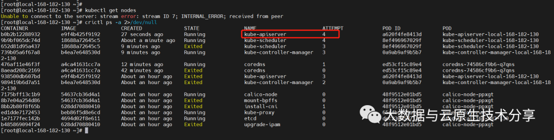 发现两个master节点,挂了一个master节点是不可用的。原因:当两个master节点还是需要2个节点可用。只有大于2个master节点才允许挂master节点,我们可以查一下允许的容器。会发现api-server的容器一直在重启或者直接挂了,小伙伴也可以去查看一下日志。stackoverflow答案