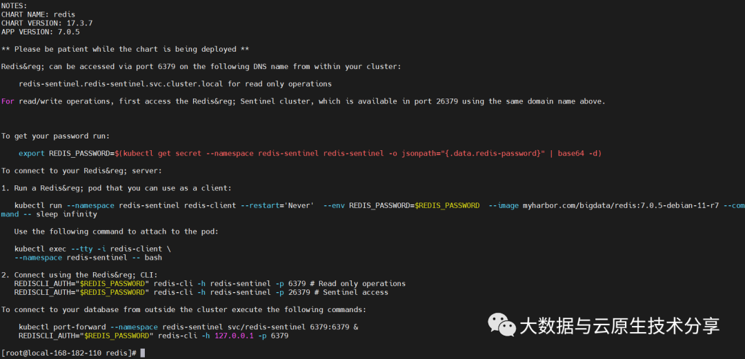 kubectl run --namespace redis-sentinel redis-client --restart='Never' --env REDIS_PASSWORD=$REDIS_PASSWORD --image myharbor.com/bigdata/redis:7.0.5-debian-11-r7 --command -- sleep infinity