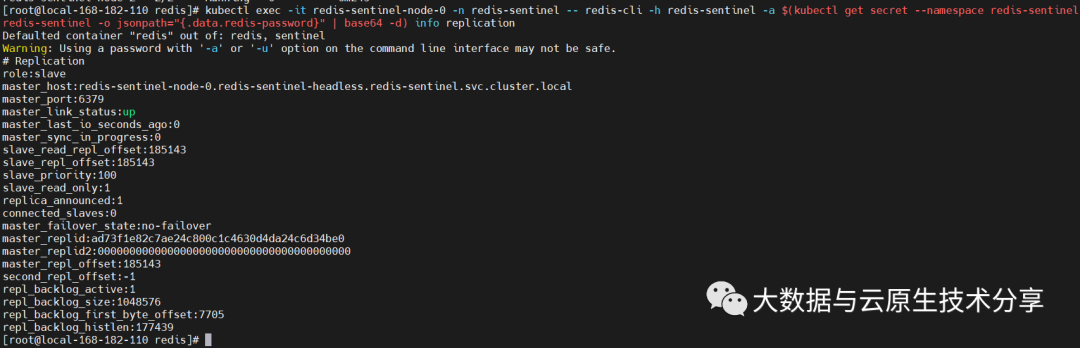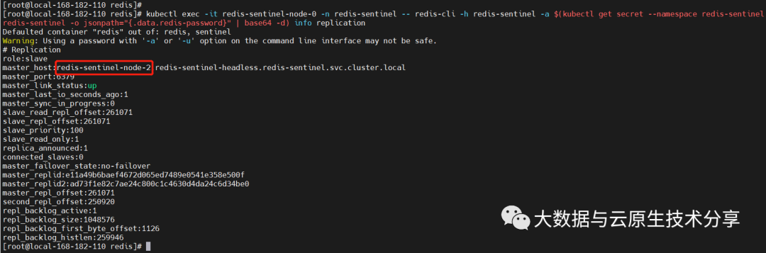 kubectl exec -it redis-sentinel-node-0 -n redis-sentinel -- redis-cli -h redis-sentinel -a $(kubectl get secret --namespace redis-sentinel redis-sentinel -o jsonpath="{.data.redis-password}" | base64 -d) info replication