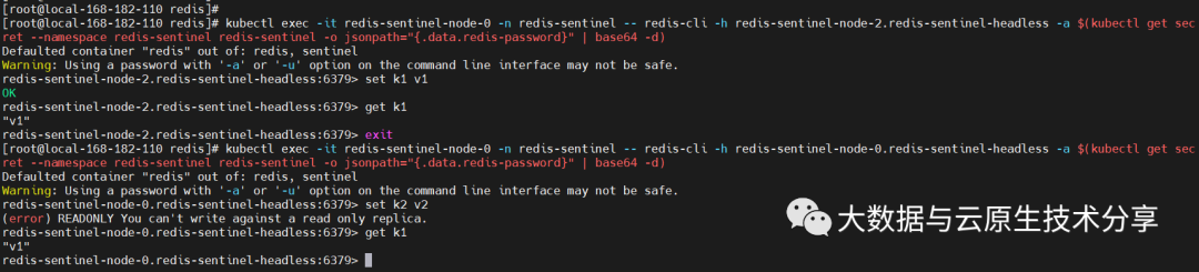 kubectl exec -it redis-sentinel-node-0 -n redis-sentinel -- redis-cli -h redis-sentinel-node-0.redis-sentinel-headless -a $(kubectl get secret --namespace redis-sentinel redis-sentinel -o jsonpath="{.data.redis-password}" | base64 -d)