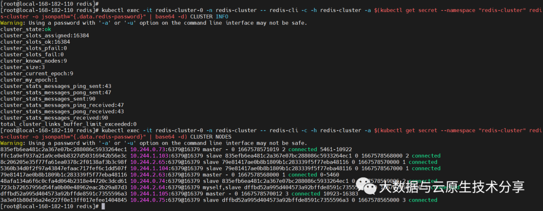 kubectl exec -it redis-cluster-0 -n redis-cluster -- redis-cli -c -h redis-cluster -a $(kubectl get secret --namespace "redis-cluster" redis-cluster -o jsonpath="{.data.redis-password}" | base64 -d) CLUSTER INFO