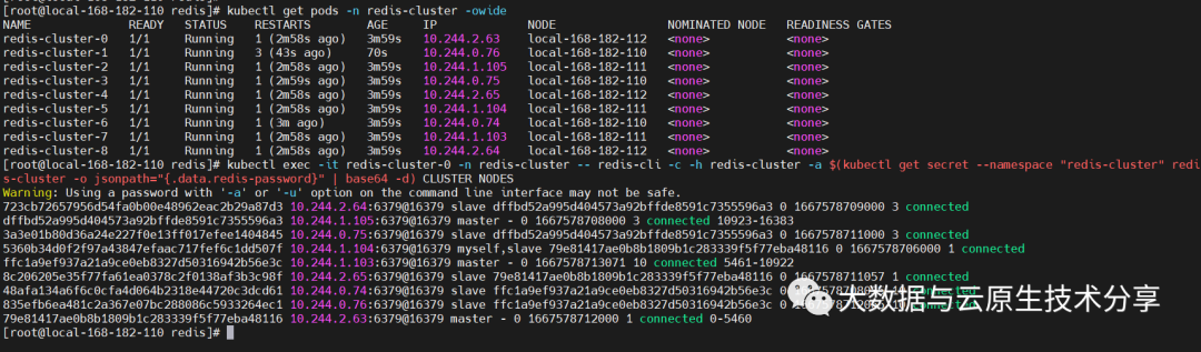 kubectl exec -it redis-cluster-0 -n redis-cluster -- redis-cli -c -h redis-cluster -a $(kubectl get secret --namespace "redis-cluster" redis-cluster -o jsonpath="{.data.redis-password}" | base64 -d) CLUSTER NODES