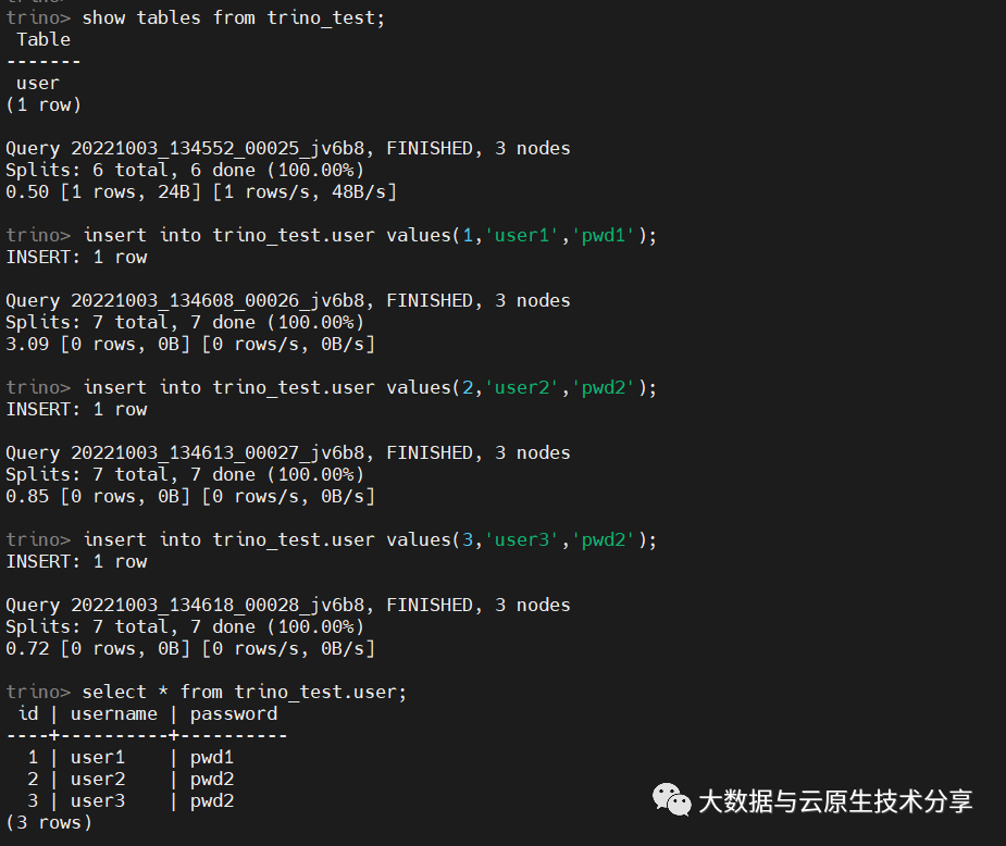 create table trino_test.user(id int not null, username varchar(32) not null, password varchar(32) not null);